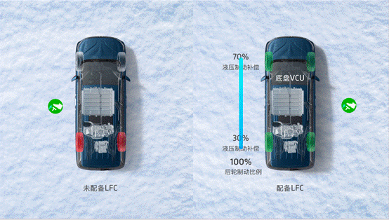 与同级竞品如同样采用后置后驱布局形式的海狮07 EV相比,在实际驾驶场景中,LFC技术的优势尤为显著。比如,当你驾驶无LFC功能的后驱新能源车型在冰雪等低附着路面上行驶时,松开加速踏板的一瞬间,后轮可能会因为突如其来的电制动而失去抓地力,进而空转、抱死。如果此时你又打了一把方向,那么车辆极有可能发生甩尾,甚至失控。然而,搭载LFC技术的岚图知音,在湿滑路面上则能实时监控后轮的状态,一旦出现后轮突破抓地力的迹象,VCU(车辆控制系统)会迅速对后轮制动力做出限制,并将这部分受限的负扭矩以机械制动的方式前7后3的分配给前后轴,同时底盘打滑监控会进一步调节前后轮制动力分配,从而实现减速时后轮制动力比例在0%-100%之间动态变化,让车辆的前后轮可以时刻分配到合适的制动力。可以说,LFC功能就是隐形的智能四驱。
