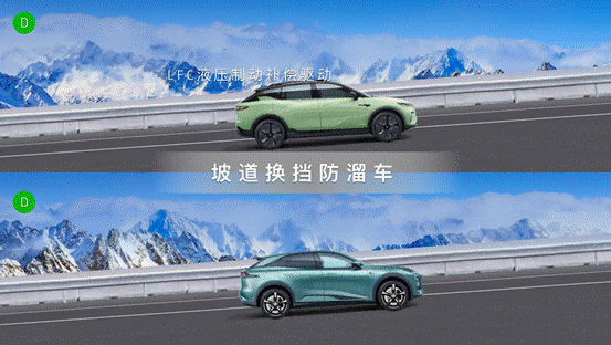 除此之外,上述动能回收问题还会造成高/满电状态下在坡道上挪车,倒挡切换D挡时会出现向后溜车的情况,其背后核心原因依然是电驱制动因条件受限无法有效执行的原因。而LFC技术则会在你看不见的地方,智能的通过机械制动来补偿这部分损失,通过机械制动补偿驱动,扭转车辆后溜趋势,并且迅速产生向前的正扭矩,快速完成从倒退到前进的换向。