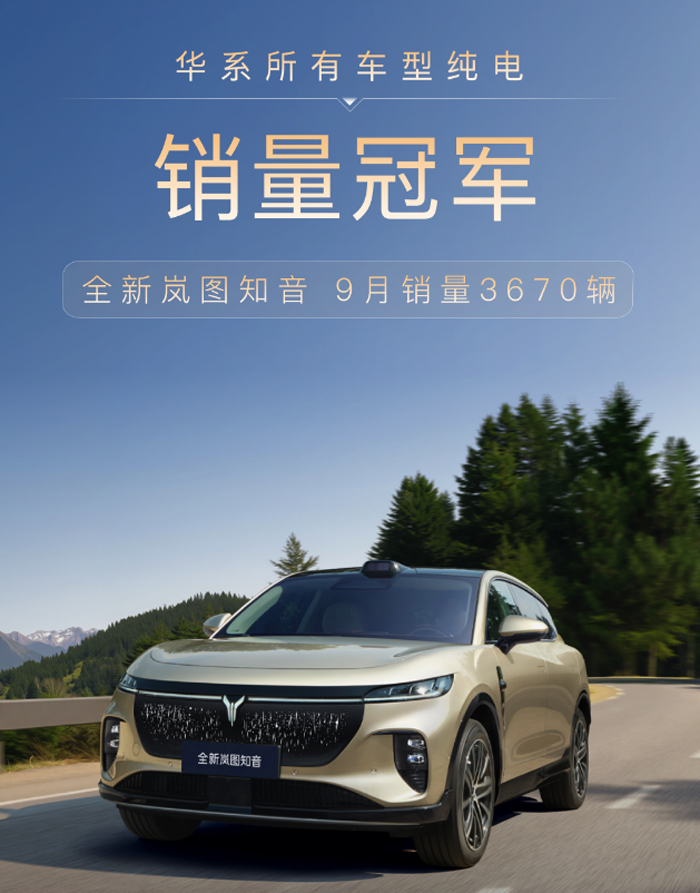 据中国银行保险监督管理委员会上险量数据统计,刚刚完成上市仅1个月的全新岚图知音展现出了强劲市场爆发力,2025年9月以3670辆的终端上险数据,成功问鼎所有华为系纯电车型销量冠军,实力超越智界R7(3050辆)、阿维塔07(2550辆)、问界M8(2490辆)等一众华为系热销车型,成为名副其实的华系纯电销冠。