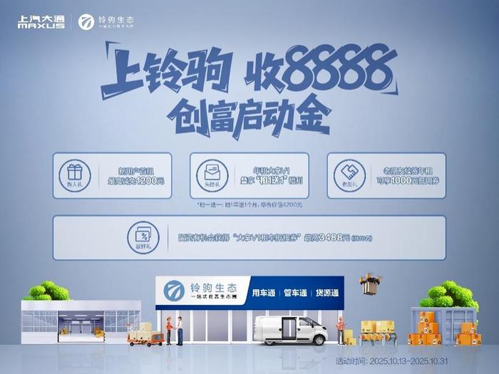 铃驹生态的发布,不仅是产品与服务体系的升级,更是上汽大通品牌使命的重要实践——为年轻奋斗者创富,为美好生活开路。作为行业唯一专为奋斗者打造的一站式创富生态,铃驹生态把创富路上的“拦路虎”逐个扫清:货运人不用再为凑齐租车押金四处周转,不用在提车等待中错失优质订单,养车时遇到的维修、保养难题,也有专业支持全程托底;更能帮你对接优质资源,解决“找货难”的困扰,让每一步创富路都走得更稳、更顺。更值得期待的是,即日起至1031日,首批加入铃驹生态的先享者,即有机会拿下价值8888元的创富基金,让你的创富征程起步更具底气!
