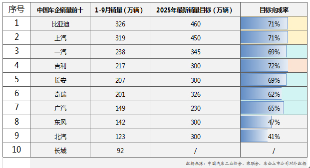 从销量前十车企的竞争格局来看,比亚迪与上汽集团共同占据第一梯队位置,1-9月累计销量均突破300万辆。其中,比亚迪以326万辆的累计销量稳居行业榜首,已顺利完成其全年460万辆最新销量目标的71%,凭借在新能源领域的技术优势与产品矩阵,持续巩固行业领先地位。上汽集团同期累计销量达319万辆,全年目标完成率同样为71%,在燃油车市场稳步推进、新能源车型加速布局的“双线并行”策略下,保持了稳健的增长节奏。