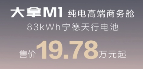 其中,纯电高端商务舱大拿M1,搭载83度宁德天行电池售价19.78万元起;纯电品质大轻客大拿V1L,83度宁德天行电池版售价17.08万元起;50度宁德天行电池版售价12.48万元起,限时一口价9.58万元起。新车上市之际,还带来价值12000元得丰厚限时上市礼遇。