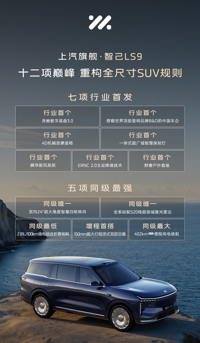 智己LS9首次完整公布了前所未有的"七项行业首发"技术,包括灵蜥数字底盘3.0、世界顶级品牌B&O音响、4D机械按摩座椅等,展现了品牌在前瞻科技领域的绝对领导地位。不仅如此,智己LS9更披露五项“同级最强”配置。驾控方面,同级唯一双向24°超大角度智慧四轮转向系统,成就“最好开的9系”;150mm超大行程闭式双腔空悬,赋予旗舰级全地形征服能力。智己LS9搭载断代领先的恒星超级增程,带来同级最长402kmCLTC纯电续航里程、同级最低2.81L/100km油电综合折算能耗,终结用户的续航与能耗焦虑,实现对同级产品的全面超越。更值得一提的是,智己LS9同级唯一全系标配520线超视域激光雷达,再次突破感知边界。