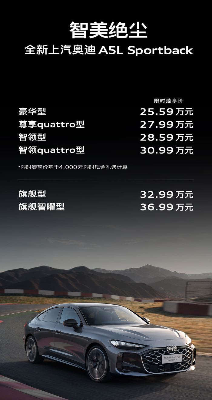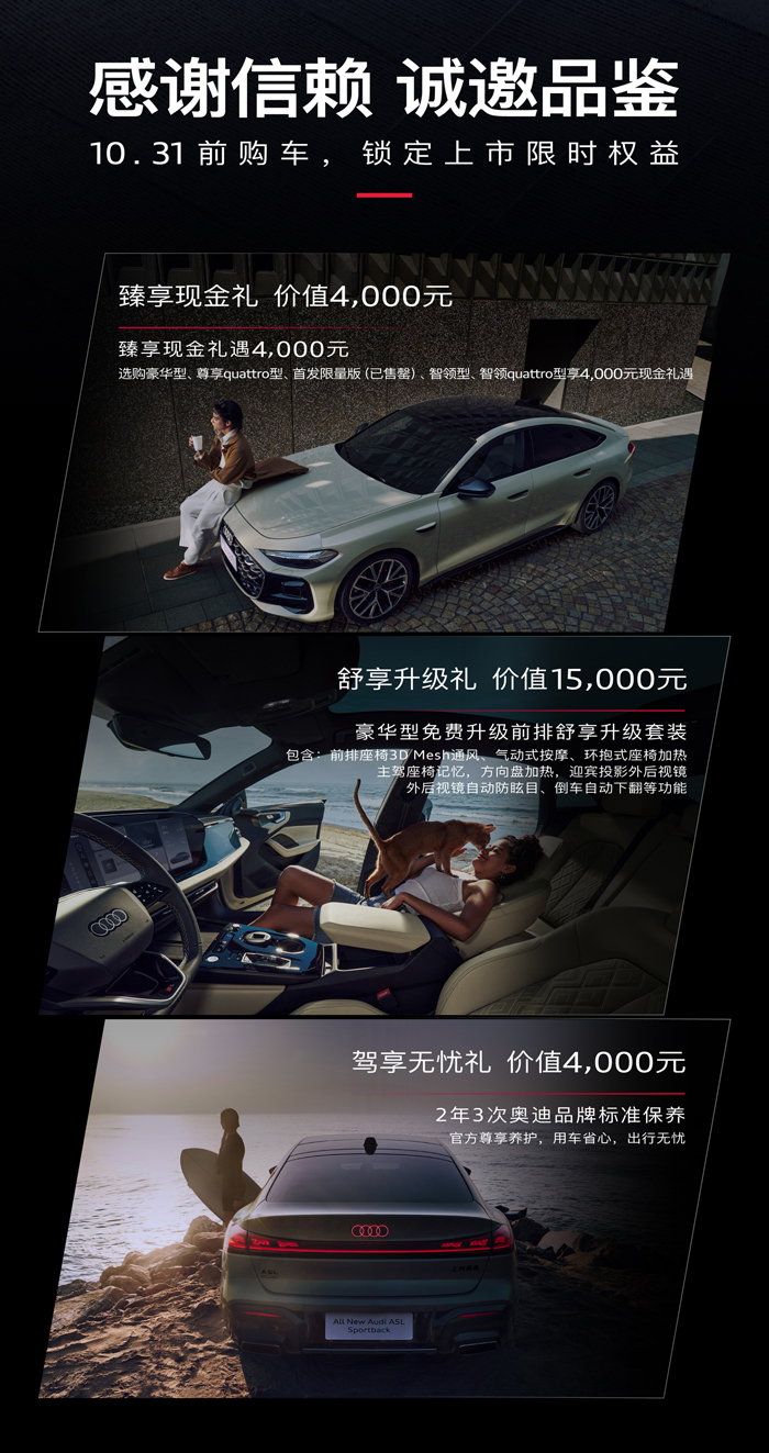 为回馈首批用户的青睐,A5L Sportback于上市首销期间特别推出多重购车礼遇。选购豪华型、尊享quattro型、智领型、智领quattro型的用户,均可享受4,000元现金优惠,直接降低购车门槛。选购豪华型的用户还可免费升级价值15,000元的前排舒享套装,其中包含前排座椅3D Mesh通风、气动按摩、环抱式座椅加热、主驾座椅记忆、方向盘加热、迎宾投影外后视镜、外后视镜自动防眩目及倒车自动下翻等多项高端配置,真正实现入门即豪华的越级体验。此外,所有购车用户均可获赠价值4,000元的驾享无忧礼,内含23次奥迪品牌官方养护服务,全方位保障用车品质与安心体验。A5L Sportback首销专属礼遇将于1031日截止,即刻预定,锁定超值用车权益。