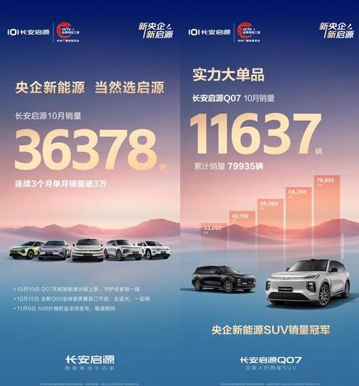 金秋十月,车市火热。长安启源延续“启源速度”,10月销量36378辆,已连续3个月单月销量破3万,展现强劲的高质量增长态势,稳居央企新能源销量头部阵营。其中,长安造车40年匠心大作—长安启源Q07表现尤为亮眼,10月热销11637辆,4月发布至今已累计销量79935辆,成为推动品牌增长的核心引擎。随着激光版上新,凭借超大空间、超长续航与全新智能的越级产品价值,长安启源Q07正成为越来越多家庭用户的信赖之选。