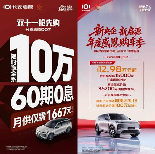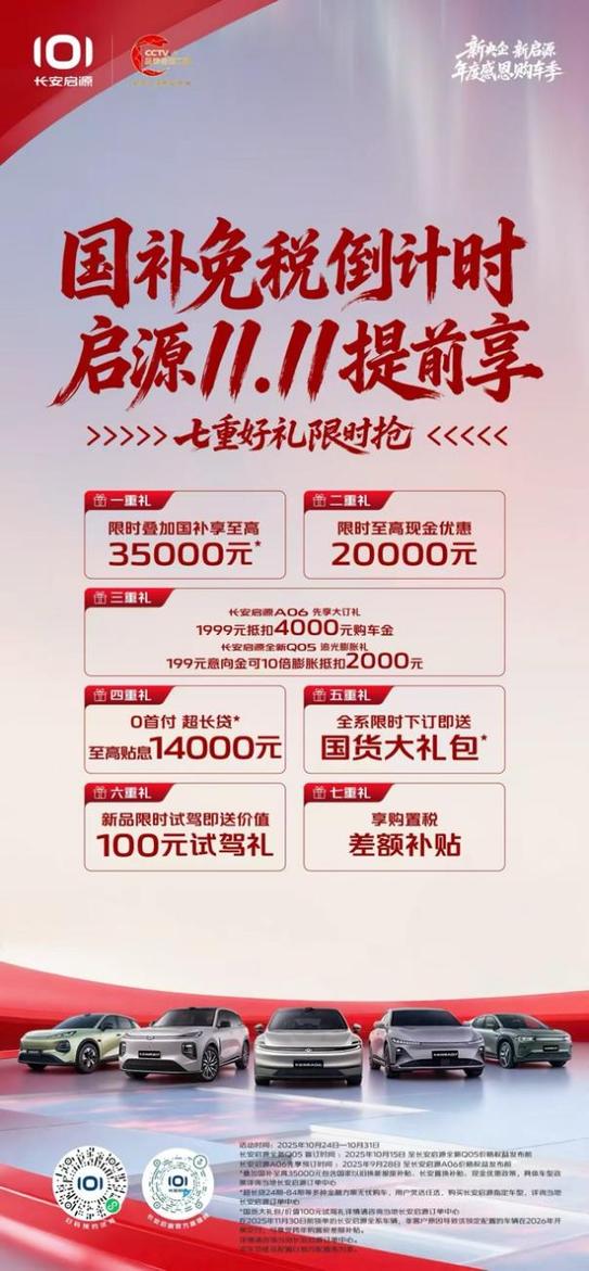随着“双十一”购物季的到来,为回馈市场厚爱,长安启源重磅开启感恩购车季活动,“启源11.11提前享”,推出限时七重购车好礼,限时叠加国补享至高35000元、限时现金优惠至高20000元、全系限时下订即送国货大礼包等钜惠政策,助力用户轻松提车。