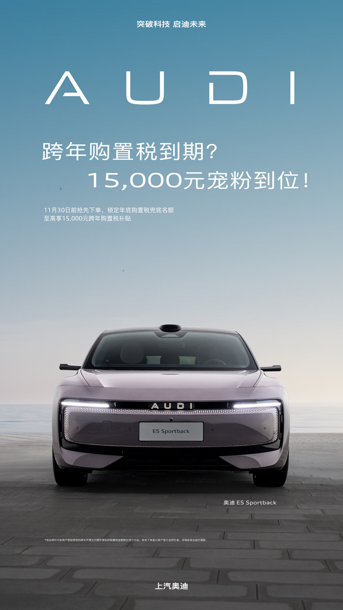随着新能源汽车购置税政策进入调整倒计时阶段,为回馈广大用户的支持,让更多消费者轻松拥有豪华智能出行体验,上汽奥迪针对奥迪 E5 Sportback推出跨年购置税补贴计划。11月30日前抢先下单,如因非用户原因导致车辆在2026年交付,即可享受至高15,000元的购置税补贴。该计划覆盖目前在售的奥迪 E5 Sportback全系车型,即刻预定,锁定补贴权益。