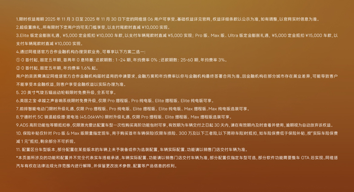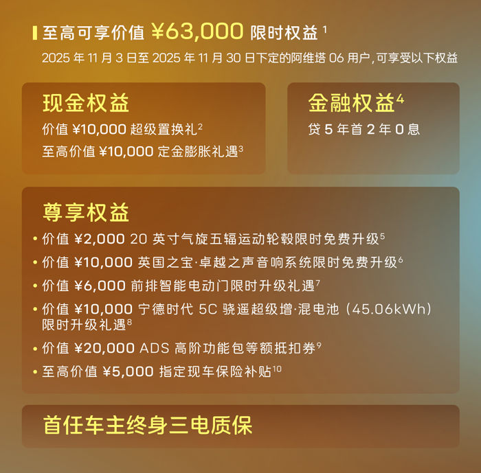 阿维塔06同步推出限时权益政策,至高可享价值63,000元限时权益,Pro增程版现金权益后到手价下探至18.99万元,并提供首任车主终身三电质保,为用户出行保驾护航。此外,阿维塔还推出了“跨年交付购置税补贴方案”,全力保障用户权益,让每一位准车主安心提车、无忧拥车。凡在2025年12月31日前(含)锁单的用户,如因阿维塔原因未能在年内完成开票,即可享受相应的购置税差额补贴。