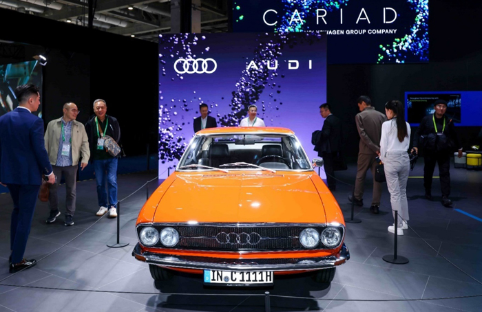 展台的左侧,奥迪旗下四环及AUDI双品牌让传奇与未来同频闪耀。全新AUDI E5 Sportback以奥迪轿跑经典曲线与本土创新科技,勾勒出智能电动豪华的全新姿态,奥迪A6L e-tron 则凭借卓越的驾乘舒适性与长续航,诠释纯电出行的从容与力量。与它们同台的,是一位来自 半个世纪前的"老朋友"--奥迪100 Coupé S。时至今日,它所承载的先锋精神仍启迪着品牌的进取之路。