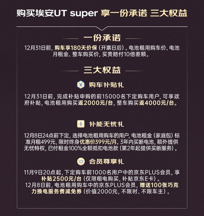 值得一提的是,京东、广汽与宁德时代还联合推出了价保权益——承诺“180天价保”。所有在12月31日24点前完成购车的用户,无论选择电池租用方案的购车价与月租金,还是整车购买价,若在提车后180天内发生降价,均可获得10倍差额赔付,真正做到“早买早划算”。在此基础上,11月30日前下定,因车辆生产、运输等非用户因素,导致延期跨年交付的购置税,可享受全额补贴;12月8日24点前下定的电池租用用户,若在3年内决定买断电池,已支付租金可100%抵扣电池费用,并享有额外无忧特权,进一步保障用户权益。