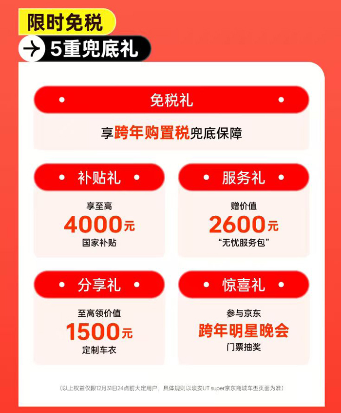 埃安UT super此次推出的“限时免税5重兜底”政策,主要面向12月31日24点前大定的用户。内容包括:若因厂商生产、运输等非用户原因导致车辆在2026年2月14日前完成开票交付,所产生的购置税差额将由厂家补贴,享受跨年购置税兜底保障;整车购买可享4000元补贴,电池租用模式购车可获2000元补贴,进一步降低购车门槛,让刚需用户轻松上车;赠送价值约2600元的无忧服务包,涵盖洗车、养护等项目,覆盖用车养车全周期;此外还提供最高1500元的定制车衣以及抽取京东跨年晚会门票的机会。