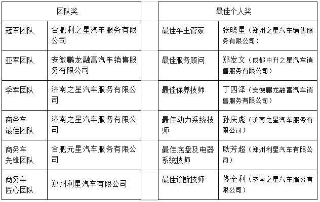 来自全国授权经销商的近5,800名选手历经5个月激烈角逐,最终合肥利之星汽车服务有限公司、安徽鹏龙融富汽车销售服务有限公司、济南之星汽车服务有限公司分获最佳团队奖冠亚季军;济南之星汽车服务有限公司、合肥元星汽车服务有限公司、郑州利星汽车有限公司分获商务车最佳、先锋和匠心团队奖,还有六位优秀的车主管家、服务顾问、保养技师、动力系统技师、底盘及电器系统技师和诊断技师分获所在岗位最佳个人奖。