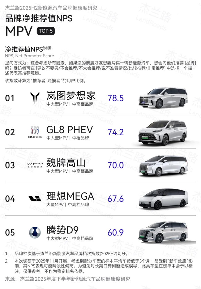 岚图梦想家在2025年下半年销量为43191台,再次蝉联高端MPV第一,2025全年达到80248台,同比增长46%。另据杰兰路发布的《2025年度下半年新能源汽车品牌健康度研究(NPS篇)》,岚图梦想家在2025年下半年以78.5分的净推荐值(NPS)位居新能源MPV榜首。作为豪华旗舰MPV,岚图梦想家在2024年、2025年连续蝉联MPV用户净推荐值第一,成为销量与口碑的“双料冠军”,持续引领中国高端MPV。
