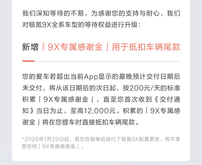 面对持续火爆的订单和大量等车用户,极氪9X推出行业最高标准的等车权益。官方公告显示,若提车时间超过极氪App显示的预计交付最晚日期,极氪将按200元/天发放用户专属感谢金,直至交付通知当日,累积金额最高12000元,并可在提车时直接抵扣尾款。