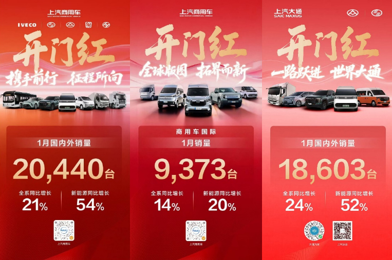 2026年开新局,上汽商用车旗下多品牌协同发力,以“开门红”奠定全年高质量增长基调。1月,上汽商用车热销20,440辆,同比增长21%,新能源车销量同比增长54%。其中国内热销11,067辆,同比增长28%,海外热销9,373辆,同比增长14%。新能源转型与全球化拓展成效显著,进一步巩固了在商用车行业的领先地位。