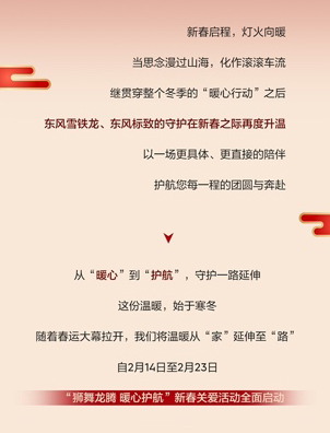 狮舞呈祥,喻示着标致般的从容自信;龙腾送福,承载着雪铁龙式的舒适安稳。多年来,东风标致和东风雪铁龙始终以此匠心,守护用户的每一程。今年春节,“暖心驿站”再度点亮,以专业服务护航平安,以真诚关怀温暖归心。东风标致和东风雪铁龙愿做您旅途中最可靠的“知音”——知音相伴,温暖随行,共赴心安归处。