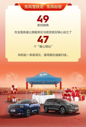 2026年春运大幕将启,归心化作万里车流。在这段满载团圆的旅途中,东风标致和东风雪铁龙再度如约而至,开启了“狮舞龙腾,暖心护航”为主题的新春出行关爱活动。2月14日至2月23日,东风标致和东风雪铁龙将联动全国49家经销商,于高速公路服务区及热门景区设立47处“暖心驿站”,将“五心守护”的承诺,从日常延伸至每一段归途。