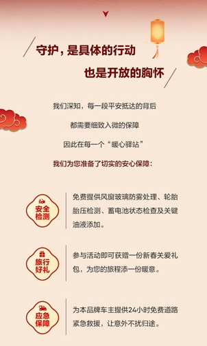 在每一个“暖心驿站”,专业技师将为车主提供包括风窗玻璃防雾处理、轮胎胎压检测、蓄电池状态检查在内的多项免费安全检测,从关键环节排查隐患,保障冬季长途行车的稳定与安全;同时,针对长途行驶中的正常损耗,驿站也提供关键油液添加服务,帮助车辆维持良好工况。此外,参与活动的车主还可获得一份新春关爱礼包,以贴心好礼为旅途增添一份节日暖意。