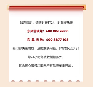 此外,东风标致和东风雪铁龙更为本品牌车主提供了坚实的后盾——24小时免费道路紧急救援服务。活动期间,车主如遇突发状况,可随时拨打专属救援热线,即可获得快速响应与专业救援,确保意外不扰归程。这些举措共同构成了贯穿旅途的守护网络,其中仅救援服务为本品牌车主专属,其余项目均体现品牌面向社会的开放与担当。