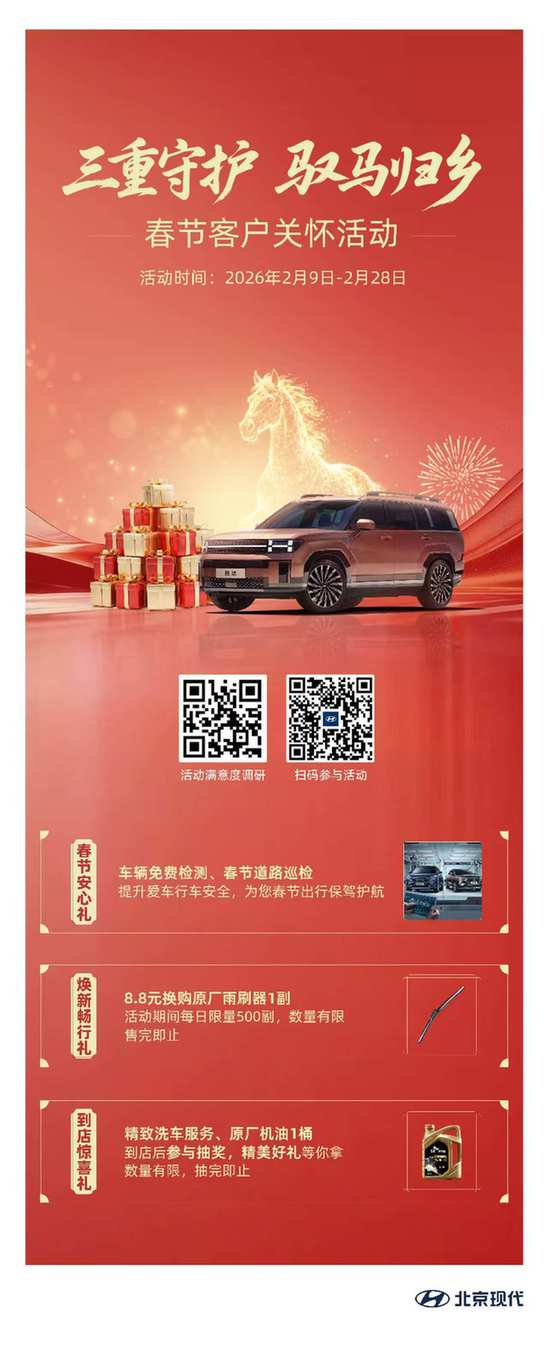 三重服务分别为爱车服务:车辆检测、轮胎充气、玻璃水添加等服务;温暖服务:提供热饮、暖宝宝贴、方便面等温暖服务;应急救援:道路救援、搭电服务及简易故障排查等服务。另外,北京现代还推出客户关怀三重礼活动,其中“春节安心礼”包括车辆免费检测、春节道路巡检,为春节出行保驾护航;“焕新畅行礼”:8.8元换购原厂雨刷器1副(活动期间每日限量500副);“到店惊喜礼”:精致洗车服务、原厂机油1桶,同时还有精美好礼抽奖活动。守护伴全程,平安过新年,北京现代用关怀铺就了用户的温暖归途。