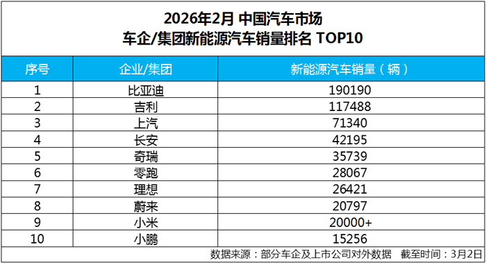 2026年开局,中国新能源汽车市场竞争格局进一步明朗。根据车企及上市公司对外披露的数据,比亚迪集团2月新能源汽车销量达190190辆,再度位居行业首位,在主流车企中持续保持明显领先优势,以稳定而强劲的表现巩固头部地位。