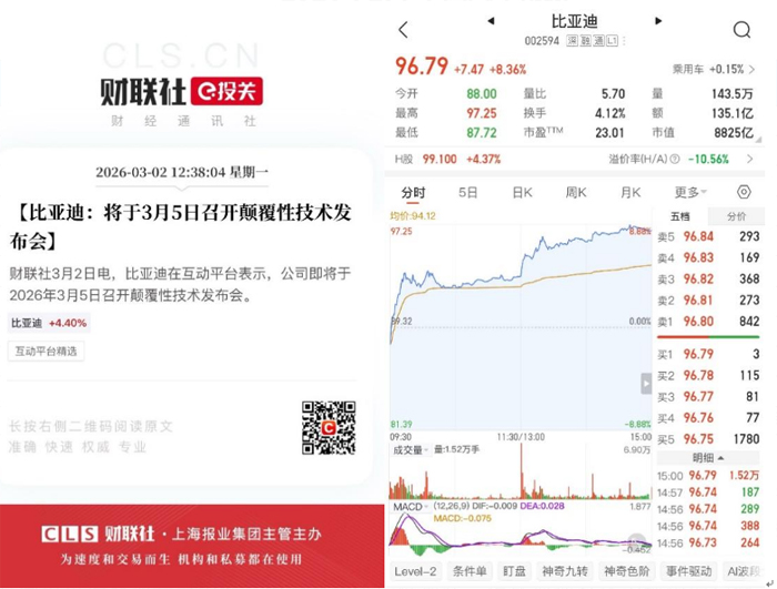 技术层面的布局同样释放积极信号。3月2日,比亚迪在互动平台宣布将于3月5日举行颠覆性技术发布会,相关消息发布后市场反应迅速,公司A股当日上涨8.36%。资本市场的反馈,显示出投资者对企业硬核技术实力的高度认可与信心。