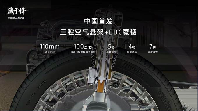 外观部分,泰山黑武士版纯黑车漆搭配全套熏黑套件营造暗藏锋芒的整体基调,玄镜万象格栅采用全镜面高光黑化工艺打造,周围景色在镜面上流转映照,隐喻侠者面对周遭繁杂而巍然不动的霸气;天地星芒轮毂经10道核心工序加工,采用专属PVD黑亮镀膜工艺提升品质,将“重”与“灵”完美融合,打造举重若轻之感。