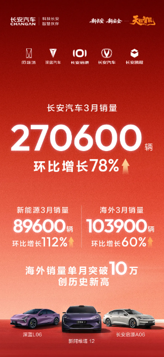 41日,重庆长安汽车股份有限公司(以下简称“长安汽车”)公布了最新的销量成绩。数据显示,长安汽车3月销量达270600辆,环比增长78%;海外销量创历史新高,达103900辆,环比增长60%;新能源销量89600辆,环比增长112%。在汽车消费政策切换、去年底市场需求提前释放的背景下,长安汽车仍然保持稳健增长势头,彰显了新央企的增长韧性与发展质量。