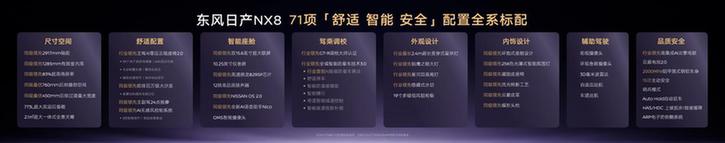 发布会上,东风日产宣布NX8全系标配71项高价值配置,在舒适、智能、安全三大维度,实现合资首个“入门即满配”。
