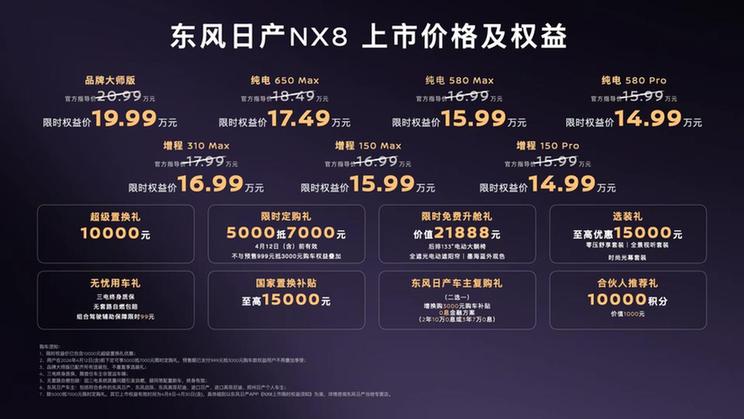 上市权益八重礼同步公布,包括超级置换礼:4月30日前下订直减10000元,叠加优惠后,东风日产NX8上市限时权益价为14.99-17.49万元;限时定购礼:4月12日前支付5000元定金可抵7000元;限时免费升舱礼:免费赠送后排133°电动大躺椅、全遮光电动遮阳帘、墨海蓝外观色;选装礼:零压舒享套装、全景视听套装、时尚光幕套装,限时超低价;以及无忧用车礼、国家置换补贴、东风日产车主复购礼、合伙人推荐礼等。