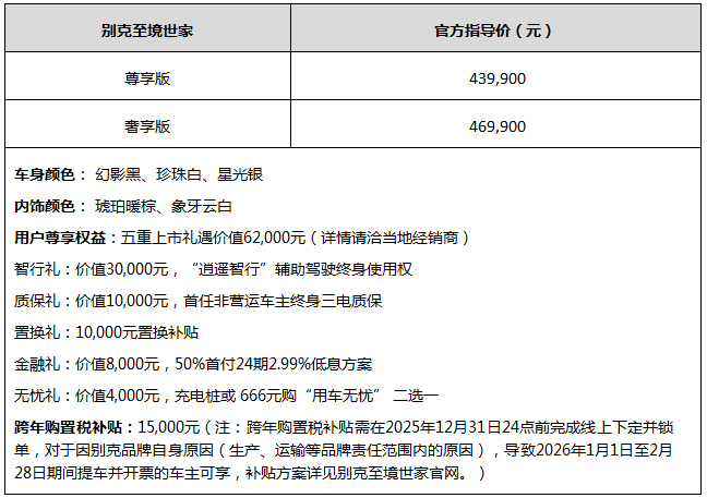 即日起,用户可通过别克官网、iBuick App、Buick小程序、别克抖音直播间,或别克全国授权经销商门店下定。在2025年12月31日24点前完成线上下定并锁单,且于2026年2月28日24点前提车并开票的车主,即可享受限时五重上市礼遇。同时在2025年12月31日24点前完成下定并锁单,且于2026年1月1日至2月28日期间提车并开票的车主,可享15,000元跨年购置税补贴。