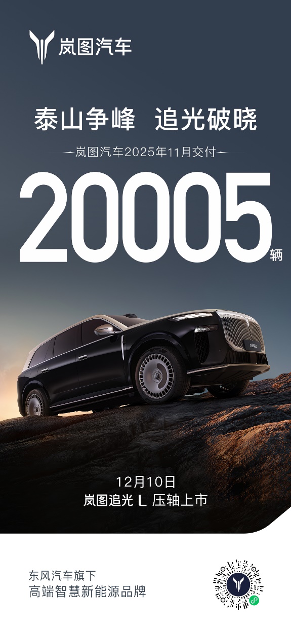 岚图汽车董事长、总经理卢放表示,“得益于广大用户的支持和信赖,岚图汽车11月交付量持续攀升,并成为国内首个达成30万辆的央国企高端新能源品牌,在新能源赛道上跑出‘岚图速度’。高端产品矩阵焕新升级,三旗舰重磅登场。岚图泰山上市后订单持续火爆,争峰豪华大六座SUV市场,岚图梦想家山河引领四座旗舰MPV进入智能豪华的全新时代,12月10日正式上市的岚图追光L将对豪华轿车市场发起冲击。岚图汽车始终坚持以用户需求为导向,打造央国企转型新标杆,彰显中国高端新能源品牌持续向上攀登的自信和实力。"